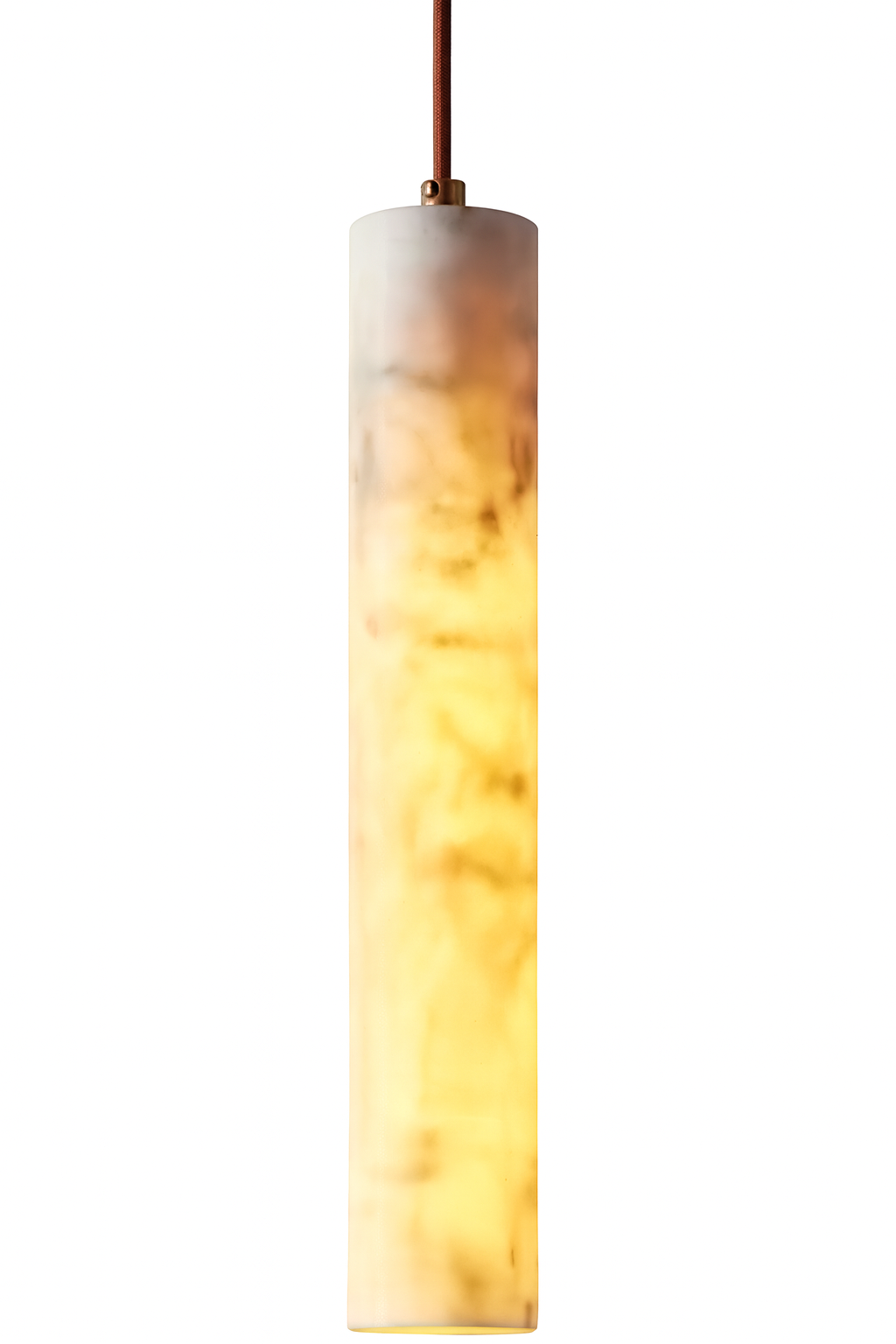 Deze elegante Moelv hanglamp straalt minimalisme en verfijning uit. De smalle cilindervormige kap is gemaakt van marmer, waardoor elke lamp uniek is door de subtiele aders en kleurschakeringen in het materiaal. Wanneer de lamp brandt, zorgt het materiaal voor een warme, diffuse gloed die een sfeervolle en luxe uitstraling aan de ruimte geeft.